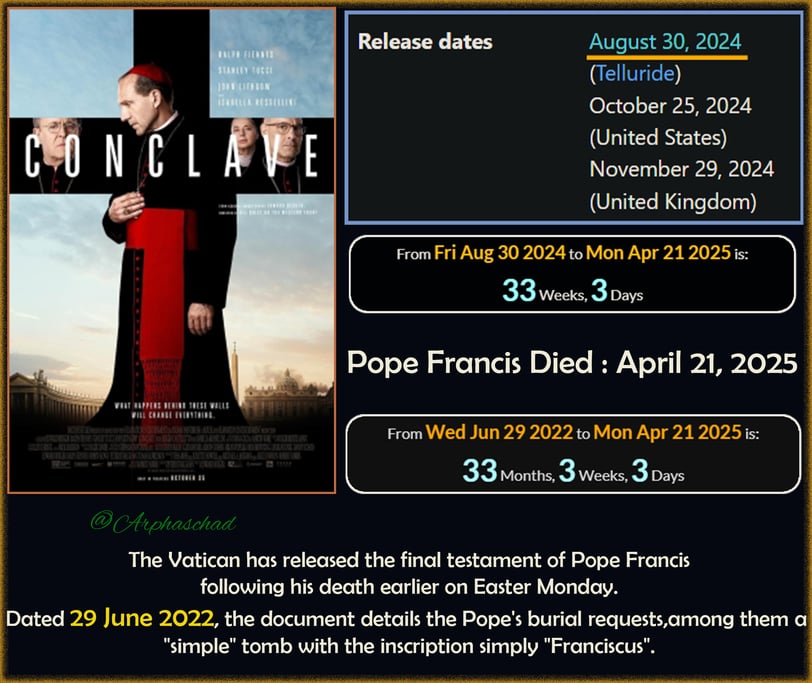 There is a 1 day delay twice involving a Pope death and King Charles III / Queen Camilla on the exact same days - wedding and wedding anniversary, (April 9, day 99)