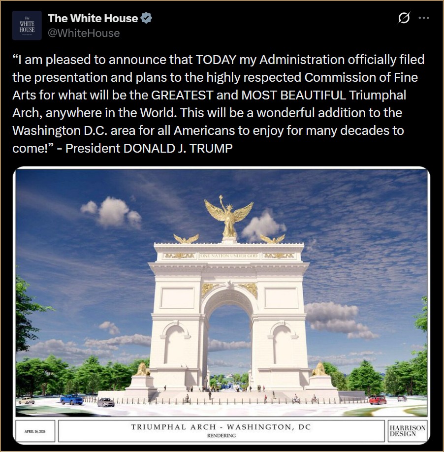 The Whitehouse tweet about this Arch for Masonic City, [Washington DC] is dated April 10, 2026.