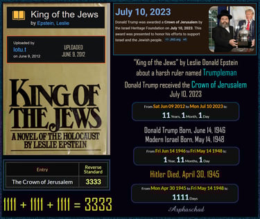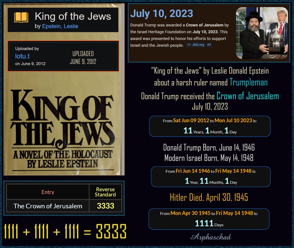 There are 6 years, 6 weeks, 6 days, between Donald Trump touching /praying at the Western Wall, Jerusalem and receiving the Torah Crown on July 10 2023.
