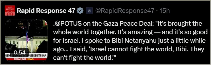October 9, 2025: Trump formally announced the deal via Truth Social and in a late-night press briefing.