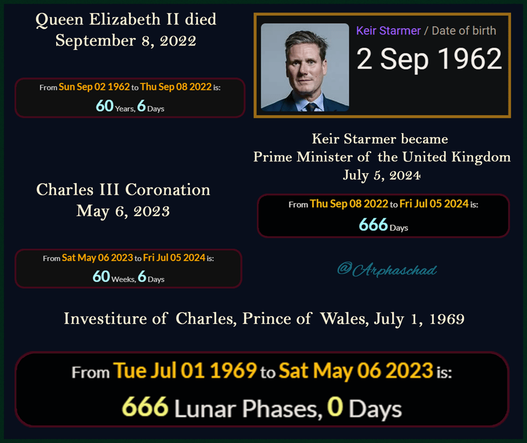 Keir Starmer was Elected 666 days after Queen Elizabeth II died , which is therefore the 666th day of the Reign of King Charles III