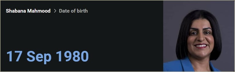 Shabana Mahmood UK Home Secretary, born Sep 17, 1980.