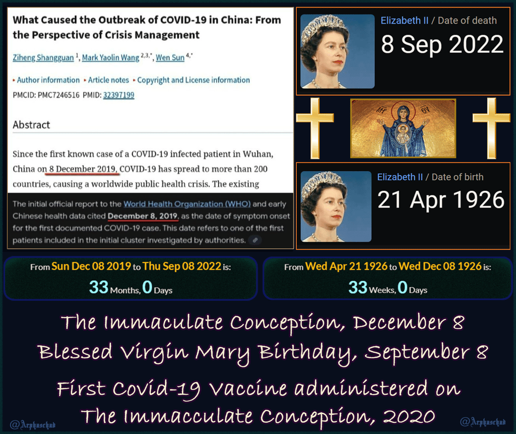 The Queen died 65 weeks 6 days after her granddaughter, Lilibet (named after Queen Elizabeth) was born 565 days after the earliest known case of Coronavirus appeared in Wuhan, China, on the anniversary of the accession of “Elizabeth I” = 56.