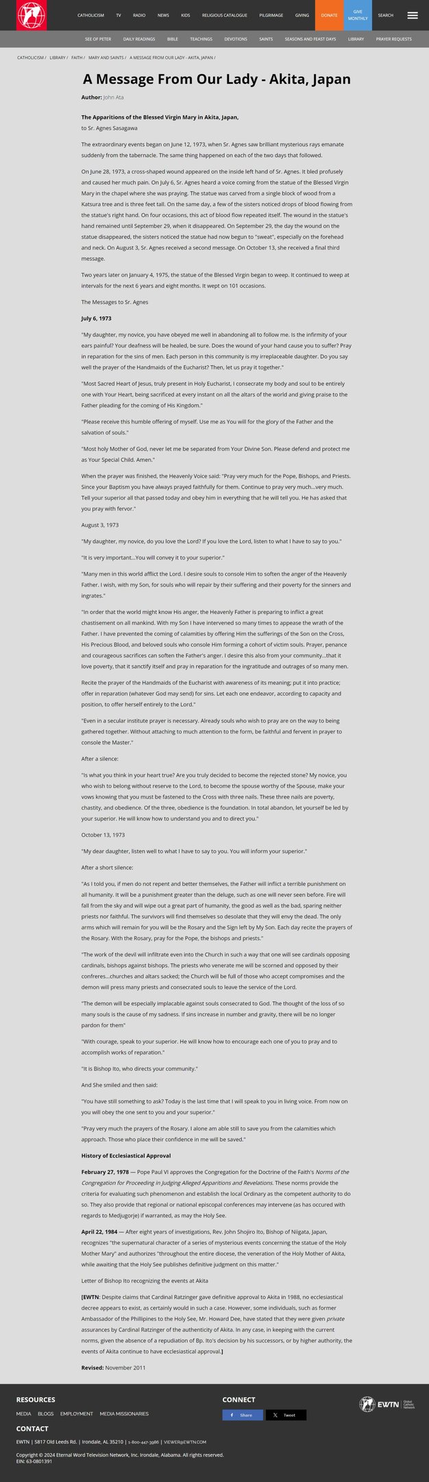 is a title of the Blessed Virgin Mary associated with the Marian apparitions reported in 1973 by Sister Agnes Katsuko Sasagawa in Akita, Japan. The apparitions emphasized prayer, especially recitation of the Holy Rosary, and penance in combination with cryptic prophecies warning of persecution and heresy within the Catholic Church. A wooden statue representing the apparitions is venerated by the Japanese faithful and other Catholics. In December of 1973, a Japanese television station videotaped tears coming from the statue’s eyes. The apparitions were unusual in that the weeping statue of the Virgin Mary was broadcast on Japanese national television, and gained further notice with the sudden healing of hearing impairments experienced by Sasagawa after the apparitions.