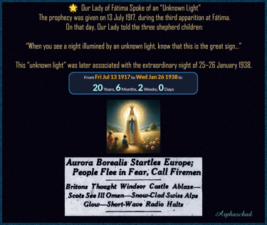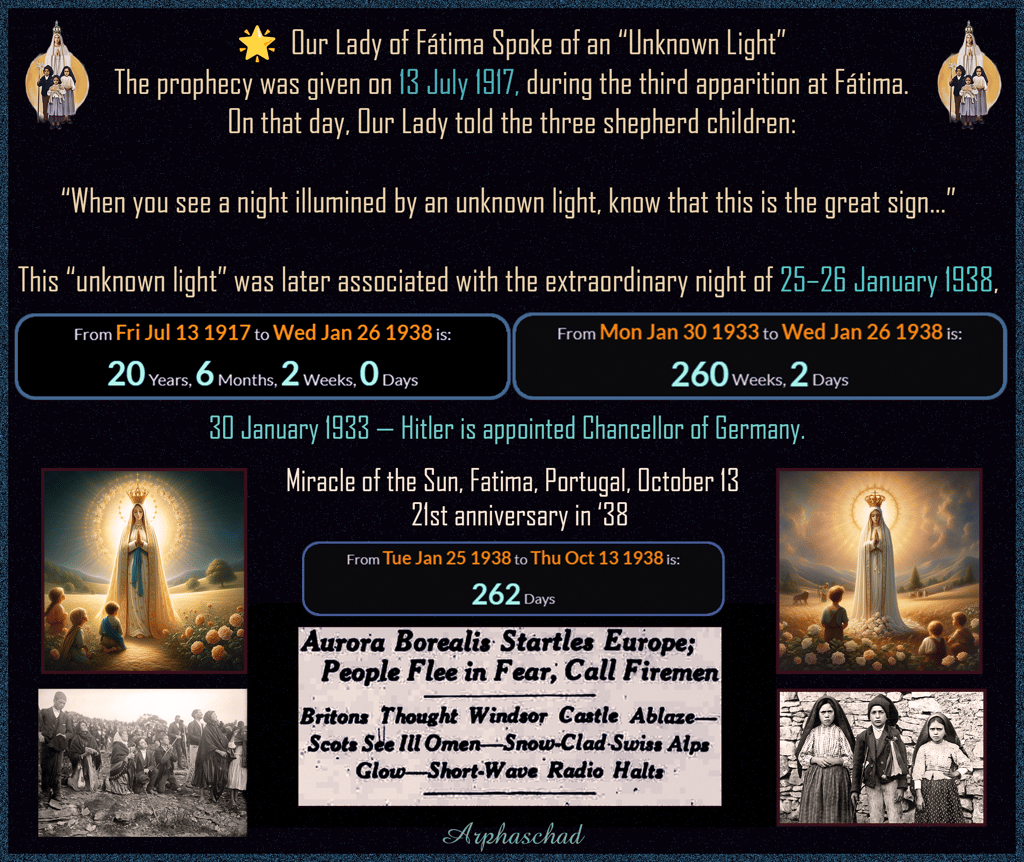 By 1938, World War II was about to break out. It would begin “during the reign of Pius XI,” signaled by “a night illumined by an unknown light”. On the night of January 25-26, 1938 – during the reign of Pope Pius XI (1922-1939) – the sky became a brilliant blood-red. Likened to the blaze of a gigantic fire and filling the evening sky, it was seen across Europe and even in parts of North America and North Africa.