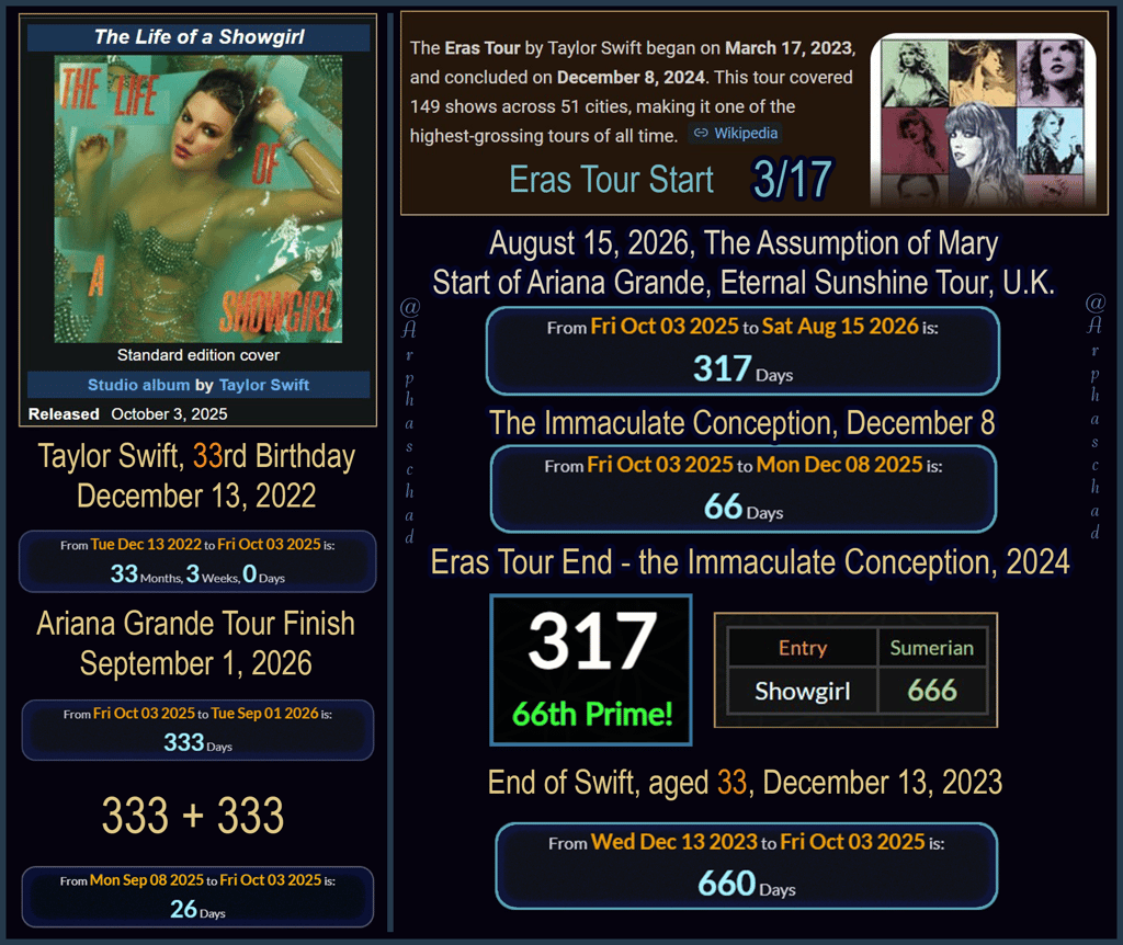 Ariana Grande finishes the Eternal Sunshine Tour 633 days after Taylor Swift finished the Eras Tour on the Immaculate Conception.