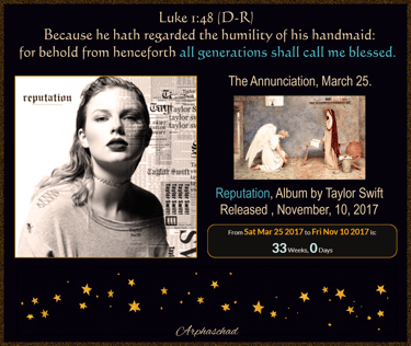 The Reputation Tour ended on the Feast of Mary at the Temple November 21 , it connects to Zeena LaVey and her satanic baptism, which was exactly 26 weeks 0 days before November 21.