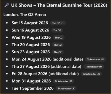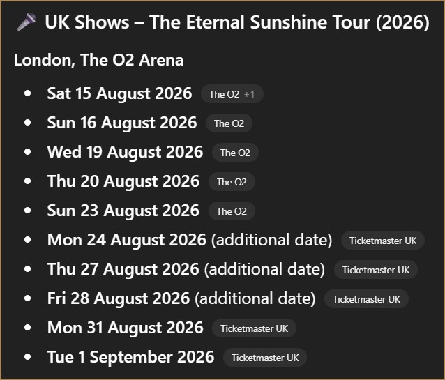 Ariana Grande starts Eternal Sunshine Tour 6/6/26.