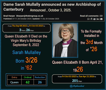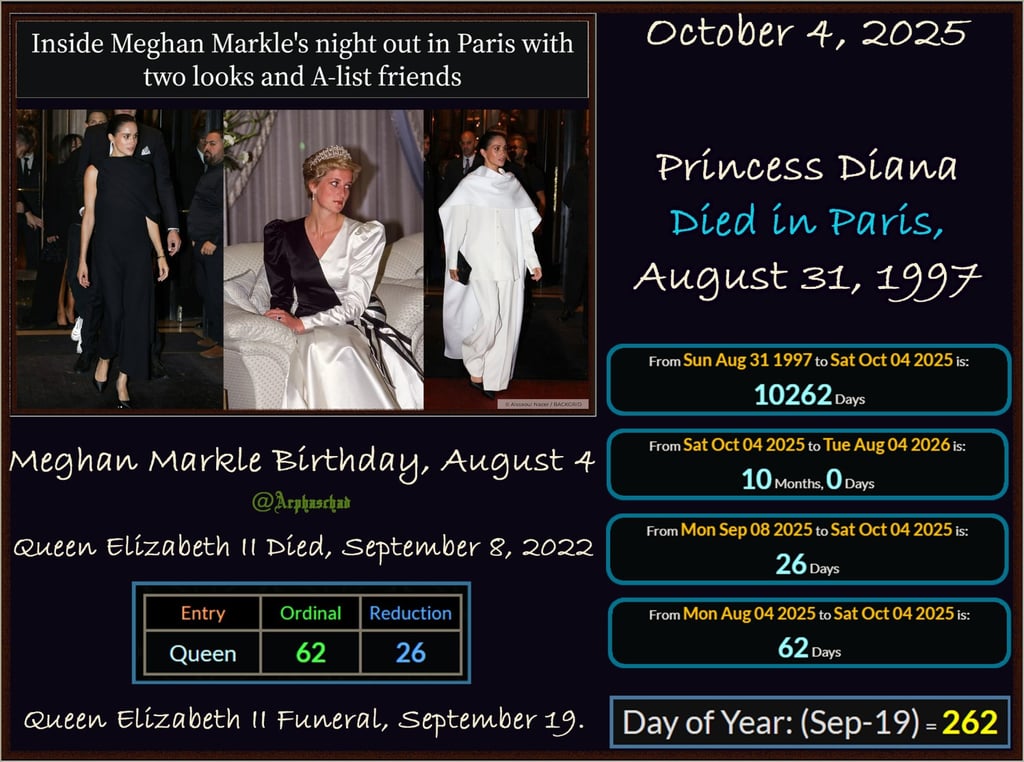 "Queen" = 26/62 [reduction/ordinal] funeral on Sep 19 - day 262.