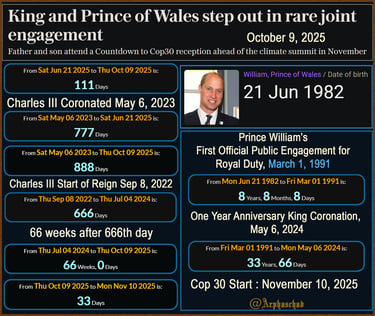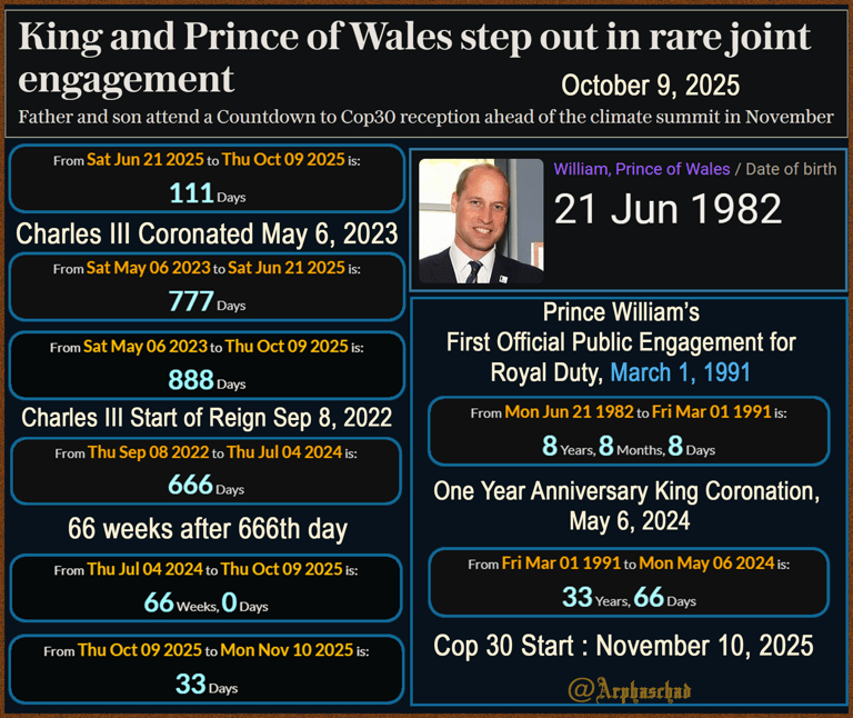 33 years 66 days after Prince Williams first public engagement at the age of 8 years 8 months 8 days old, was the ONE year anniversary of King Charles III Coronation.