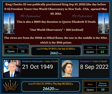 King Charles III was publically proclaimed King Sep 10, 2022 [the day before 9/11] Freedom Tower One World Observatory in New York , USA, opened May 29, 2015.