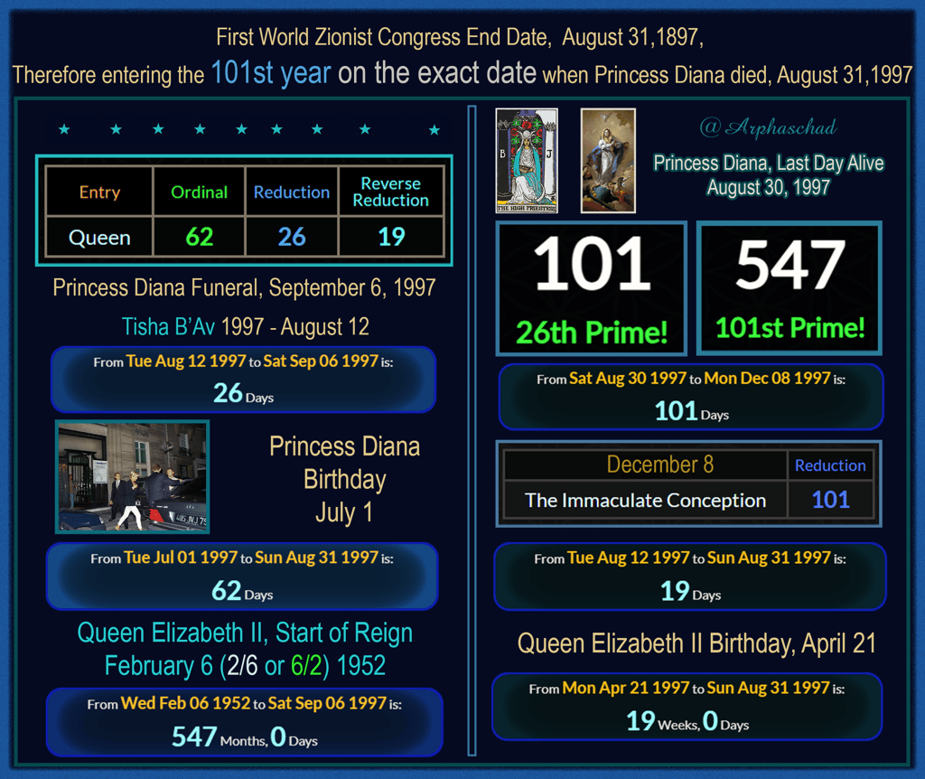 Between Princess Diana's Birth and this Funeral Anniversary entering the TWENTY SIXTH year are 62 years 26 days [Prophetic Calendar}