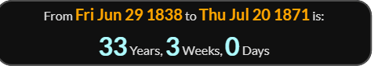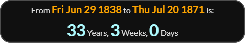 There are exactly 33 years 3 weeks [0 days] between The Coronation of Queen Victoria and British Columbia becoming part of the Canadian Confederation.