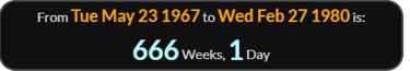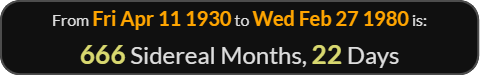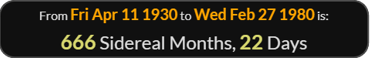 666 Sidereal Lunar Months 22 Days after the Founder of the Church of Satan was born, April 11, 1930 [Anton LaVey]