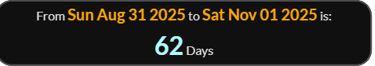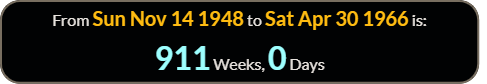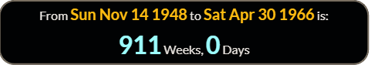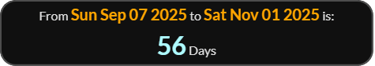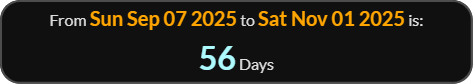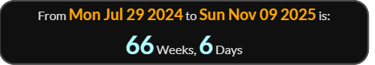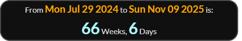 So media reporting on November 2, 2025 is exactly 66 weeks 0 days since , and 66 weeks 3 days will be the day leaving 56 - see reference code below