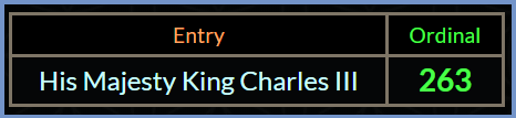 "His Majesty King Charles III" = 263 [ordinal]
