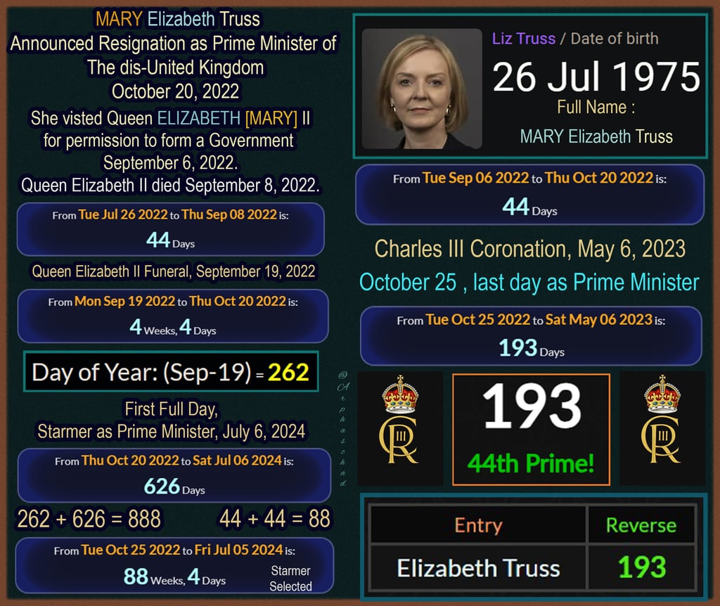 Liz [Mary Elizabeth] Truss visited Queen Elizabeth [Mary] on Princess Diana's Funeral Anniversary [Sep 6, 2022] for permission to form a government.