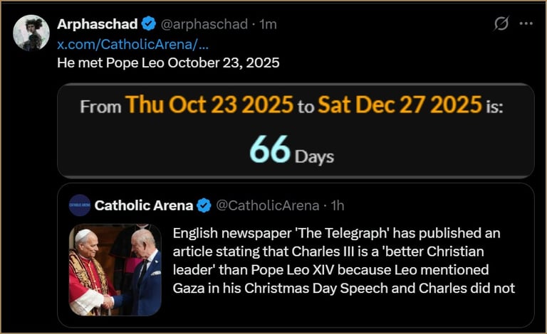 In the 360/12 prophetic calendar he was aged 62 years 266 days on the 666th day of the reign of Charles III , when he was selected. See Royalty for numerous 266 links.