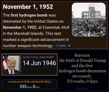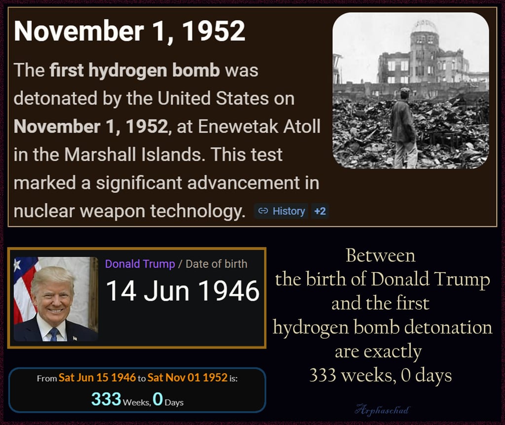 First Atom Bombs 3 days apart 3333 after James Garfield died after being shot.