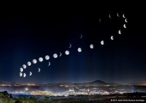 If you photograph or plot the Moon at the same clock time every day, its position drifts in a looping pattern that becomes a tilted figure‑8.