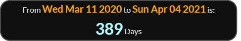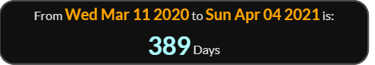 Covid 19 was declared a pandemic 389 days before Passover End 2021 which was Easter Sunday.