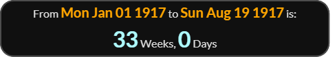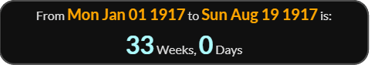 July 13, 1917 is exactly 108 years 33 weeks [0 days] before USA/Israel start bombing Iran February 28, 2026.