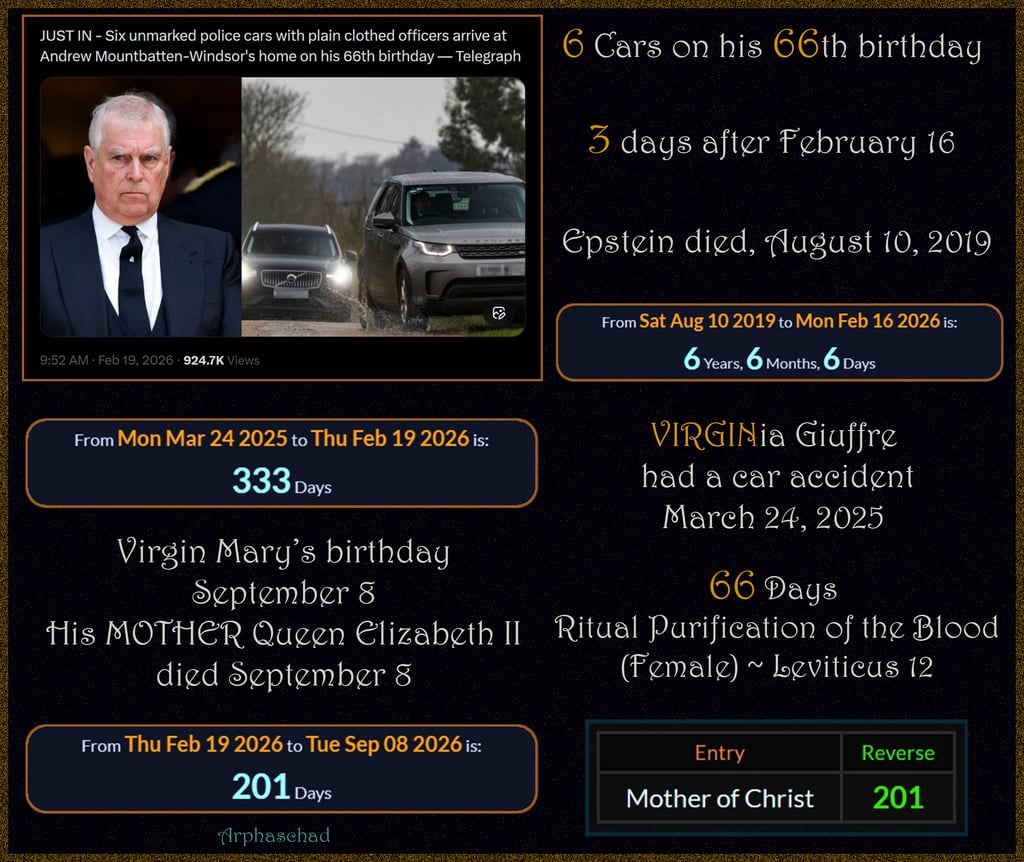 Prince Andrew arrest at age 66, was exactly 7 weeks 0 days to Passover End (Israel) and the anniversary of Pope John Paul's funeral [21st]( April 8, 2005 ).